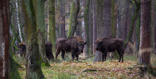 Stado polskich żubrów w jesiennym lesie Pszczyny Jankowice
