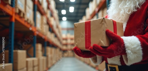 Santa Claus stands in a warehouse full of boxes holding a gift. He is ready for holiday delivery and helping with online retail order distribution.