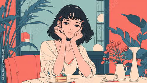 レトロポップなカフェシーン、女性の柔らかなまなざしが印象的なアート風イラスト、静かな午後と洗練された空間を描いた現代風ヴィジュアルストック素材