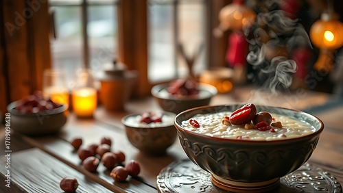laba. Steaming bowl of Laba porridge with dates and nuts on wooden table. menu design, packaging mockups, designed for culinary blogs and recipe cards for restaurants, supports restaurant marketing.