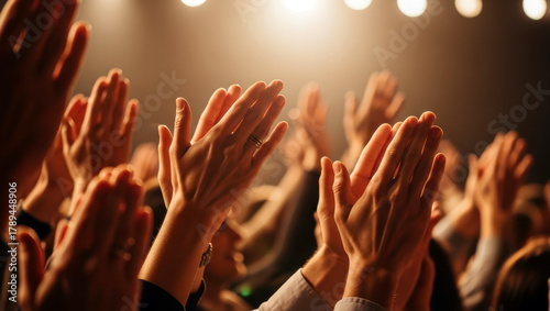 행사장 조명 아래 여러 사람이 박수를 치는 이미지