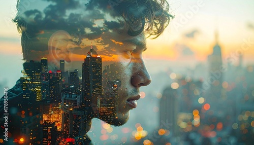 Dynamic double exposure a pensive young man's silhouette merged with a vibrant city skyline, symbolizing ambition, dreams, and urban aspirations at sunset