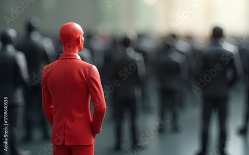 red figurine of a man stands aside from the crowd of people. Asociality, sociopathy. Rejected from society, lonely. Development of leadership and social qualities. Infected, fear and misunderstanding.