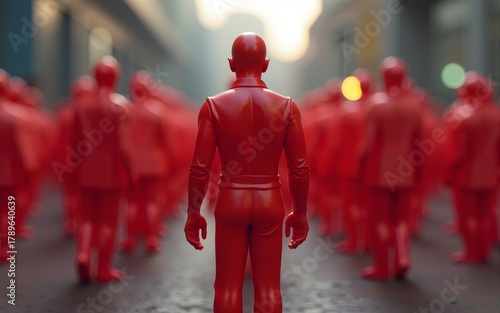 red figurine of a man stands aside from the crowd of people. Asociality, sociopathy. Rejected from society, lonely. Development of leadership and social qualities. Infected, fear and misunderstanding.