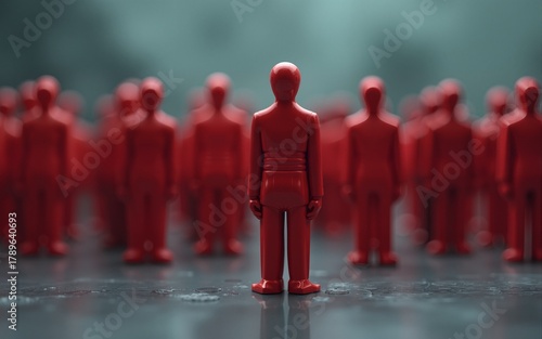 red figurine of a man stands aside from the crowd of people. Asociality, sociopathy. Rejected from society, lonely. Development of leadership and social qualities. Infected, fear and misunderstanding.