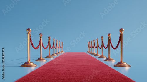 3d illustration of a red carpet with golden stanchions and ropes on a blue background, a cinema concept. Ai generated