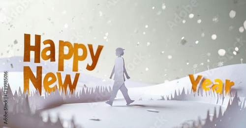 Winter scene depicts person walking toward new year. Snowflakes fall upon landscape, festive greeting visible.
