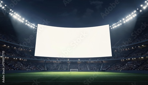 Blank big screen in stadium at night with lights. Arena with empty display billboard for advertising. Mockup template background for sport event or football match. Place your text on screen.