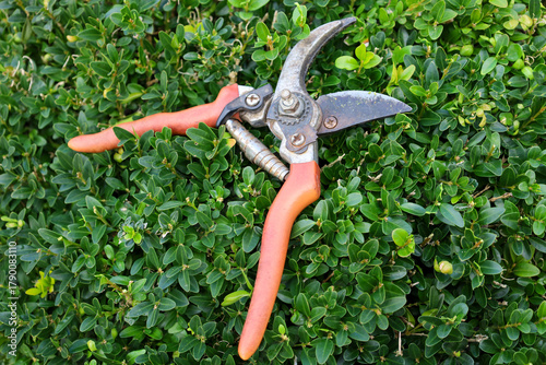 Garden shears with orange handles rest on the dense, glossy leaves of an evergreen shrub, creating a vibrant contrast. The close-up depicts the pruning tool and healthy greenery, ideally illustrating