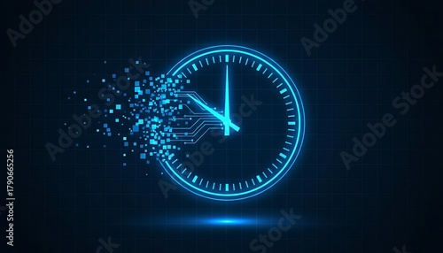Digital clock face dissolving into particles, representing the passage of time and data flow