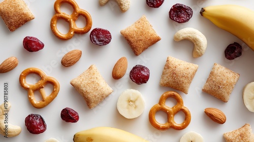 top view various snacks artistically displayed on light surface. assortment includes pretzels, dried fruits, nuts and fresh bananas, creating lively and healthy snack scene