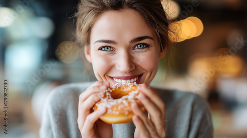 Portrait of hungry young woman sitting in fast food restaurant and eating delicious doughnut, joyful expression, casual lifestyle, with copy space