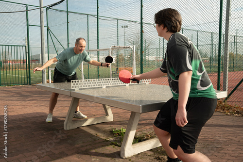 dwie osoby grające w tenisa stołowego na zewnątrz, na obiekcie sportowym