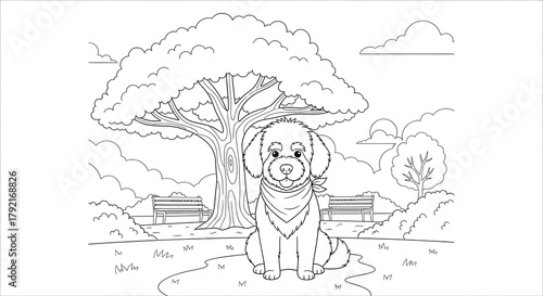 A Cute Puppy Sitting Under a Tree in a Park Coloring Page