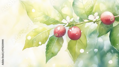 51.Watercolor painting of a coffee tree with lush green leaves, red coffee cherries glistening in the light, and dainty white flowers, giving the scene a soft and peaceful vibe, with light splashes