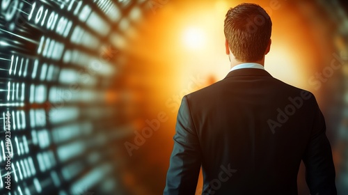 Businessman in suit viewed from behind, facing glowing binary code on screen, symbolizing data analysis, digital transformation or tech leadership.