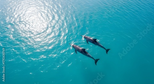 Un alto ángulo de visualización de dos delfines mulares, tursiops truncatus, nadando cerca de la superficie