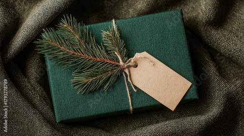 #659919088Green gift box wrapped with twine, accompanied by a blank card and pine branch, creating a festive atmosphere for holiday celebrations and gift-giving moments