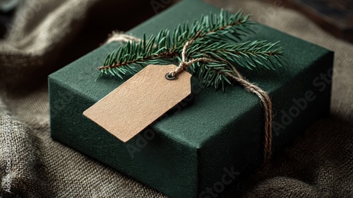 #939705130Holiday gift box with blank tag surrounded by festive fir branch on concrete surface in Scandinavian minimalism style
