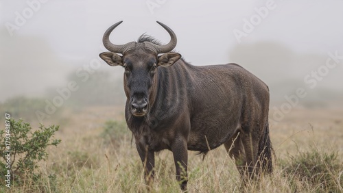 Wild buffalo in grassland with horns and dark fur. Nature and wildlife, animal photography. The wildlife and habitat of large herbivorous mammals