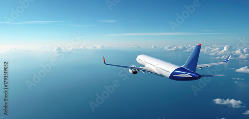 White passenger jet flies over blue ocean water under sky with clouds. Airplane travels high above sea on sunny day. Modern airliner cruises in clear atmosphere.