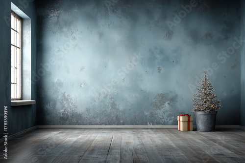 Jasny, pusty pokój w niebiesko-szarych odcieniach, z betonową ścianą i drewnianą podłogą. Mała choinka w wiadrze i skromny prezent w rogu. Surowy klimat świąt.