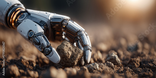 Robotic hand extracting rare earth minerals for green tech innovations industrial site macro shot futuristic environment