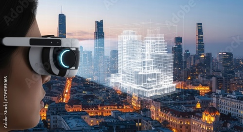 Future Sight: A person dons augmented reality glasses, blending the tangible cityscape with digital architectural schematics, visualizing a vision of tomorrow.