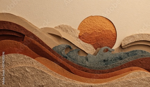 An artistic paper cutout depicts a serene seascape with layered waves, a textured sun, and a warm, earthy color palette, creating a tranquil and visually appealing composition