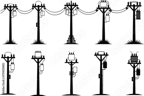 Flat vector illustration of utility poles with transformers, insulators, power lines, urban electrical infrastructure silhouette set