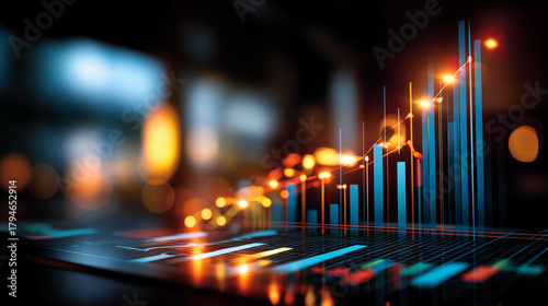 Dynamic 3D bar chart visualization with glowing lights faceless data growth representation defocused red and blue background financial analysis display modern tech environment