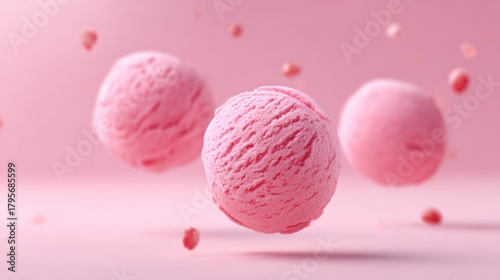 Delicious Pink Ice Cream Scoops Floating in a Soft Pink Background, Perfect for Summery Treats and Refreshing Desserts That Delight the Senses