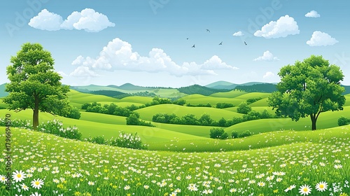 A vibrant and lush green landscape under a bright blue sky with fluffy white clouds, featuring rolling hills, trees, and a field of daisies.