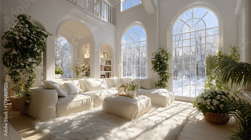 Luksusowy, jasny salon z wysokim sufitem i łukowymi oknami z widokiem na zimowy krajobraz. Białe, puszyste meble i dużo zielonych roślin.