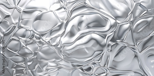 Abstrakcyjna srebrna powierzchnia przypominająca pogniecioną folię, metaliczne tło.