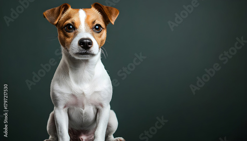 Jack Russell Terrier dog sits on grooming table. Its fur is trimmed. The canine looks calm and attentive. Green background with