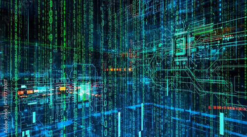 Abstract futuristic dark cyberspace with glowing vertical binary code digital data stream and electronic circuit board elements