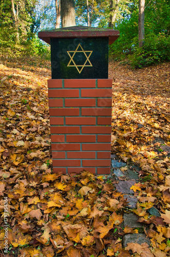 Barlinek (niem. Berlinchen) – Ceglany słup z ciemnym kamiennym zwieńczeniem i gwiazdą Dawida stoi wzdłuż leśnej ścieżki usłanej liśćmi.