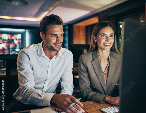 Pracownicy w firmie pracują wspólnie nad zagadnieniem korzystając z komputera. Motyw współpracy, korzystania z aplikacji, internetu, praca zespołowa