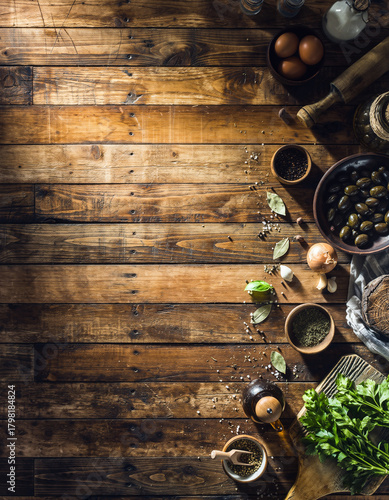 Tło kulinarne z przyprawami w miseczkach, ziołami, nożami, warzywami i deskami do krojenia leżącymi na drewnianym blacie
