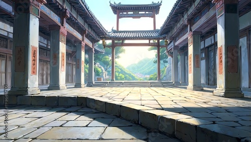 ゲーム背景 中華ファンタジーの巨大寺院につながる通路門