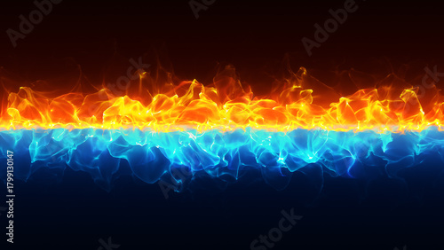 青とオレンジの炎がぶつかり合う、炎の線の枠のイラスト