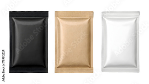 Row of three blank square packaging sachets in black, brown kraft paper, and white, ready for product mockup and branding.