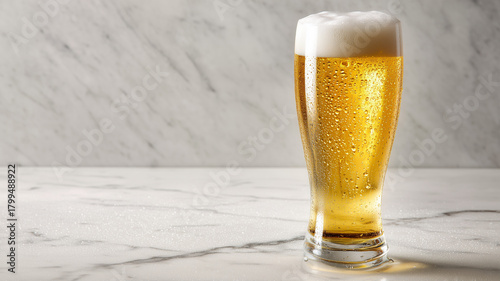 大理石のテーブルに置かれたビールグラスが醸す、洗練されたミニマルなシーン