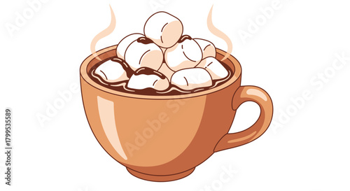 A delightful illustration depicts a steaming mug of rich hot chocolate generously topped with fluffy white marshmallows, evoking a sense of cozy winter comfort.