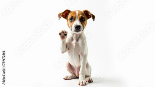 A brown and white dog sitting on its hind legs, looking friendly