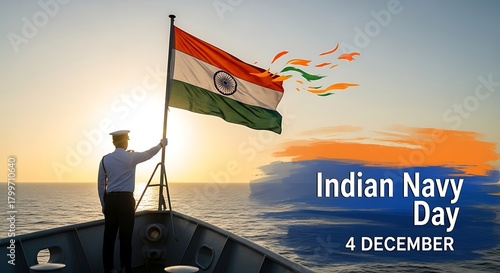 Proud indian sailor salutes waving indian flag on naval ship at sunrise celebrating indian navy day