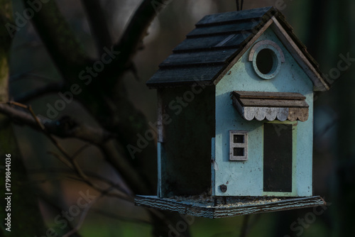 Drewniany niebieski karmnik w cieniu leśnych drzew