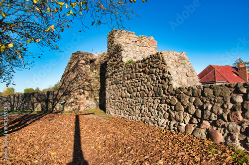 Strzelce Krajeńskie – ruiny zabytkowego muru kamiennego otaczającego miasto wśród jesiennych liści i jasnego nieba w spokojnej starówce.