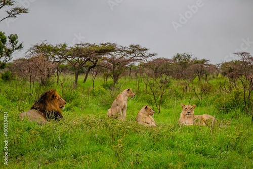 Lions (Panthera leo) are an important part of the African wildlife. The photo shows a lion family living in the Southern African savannas.